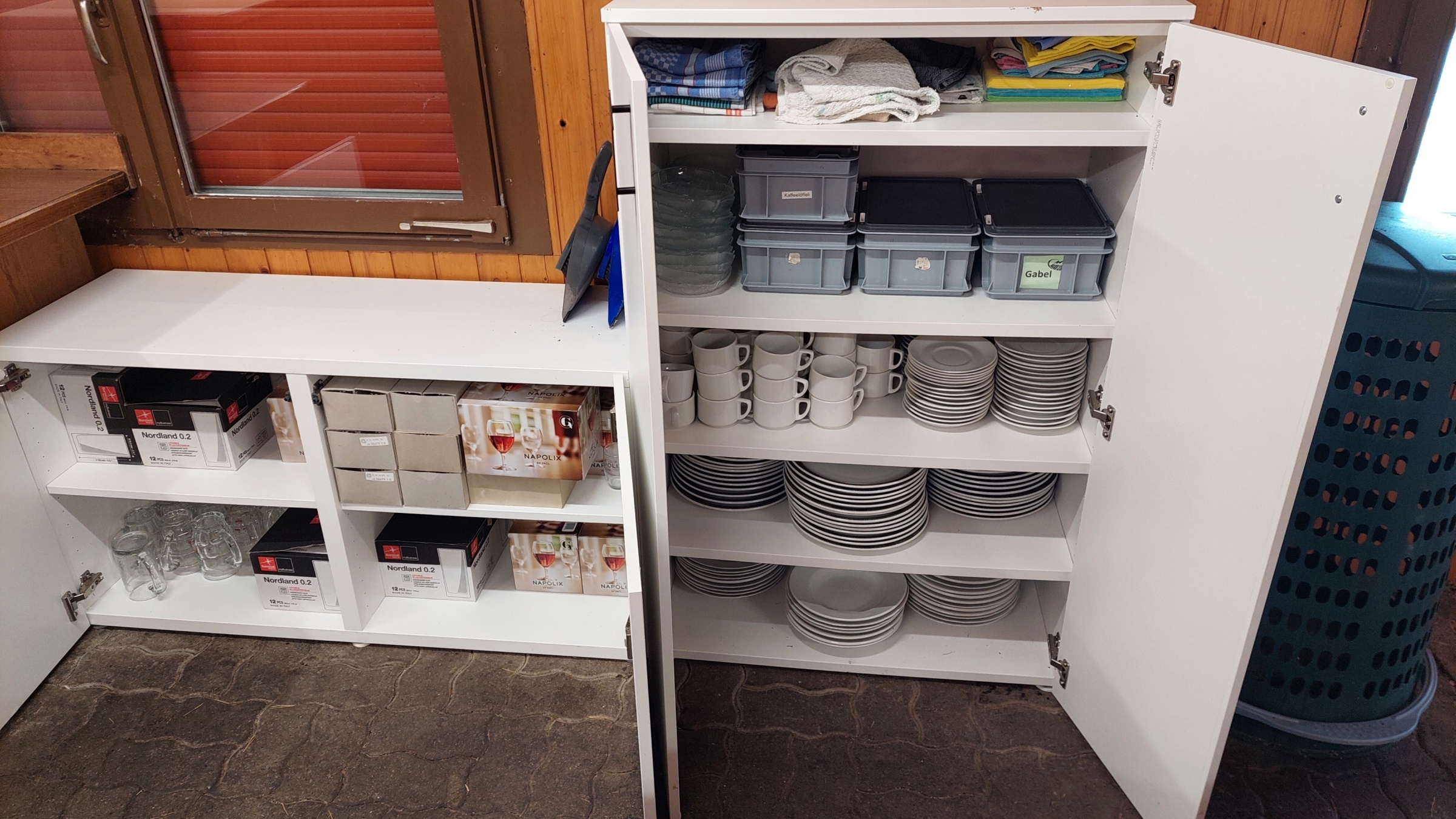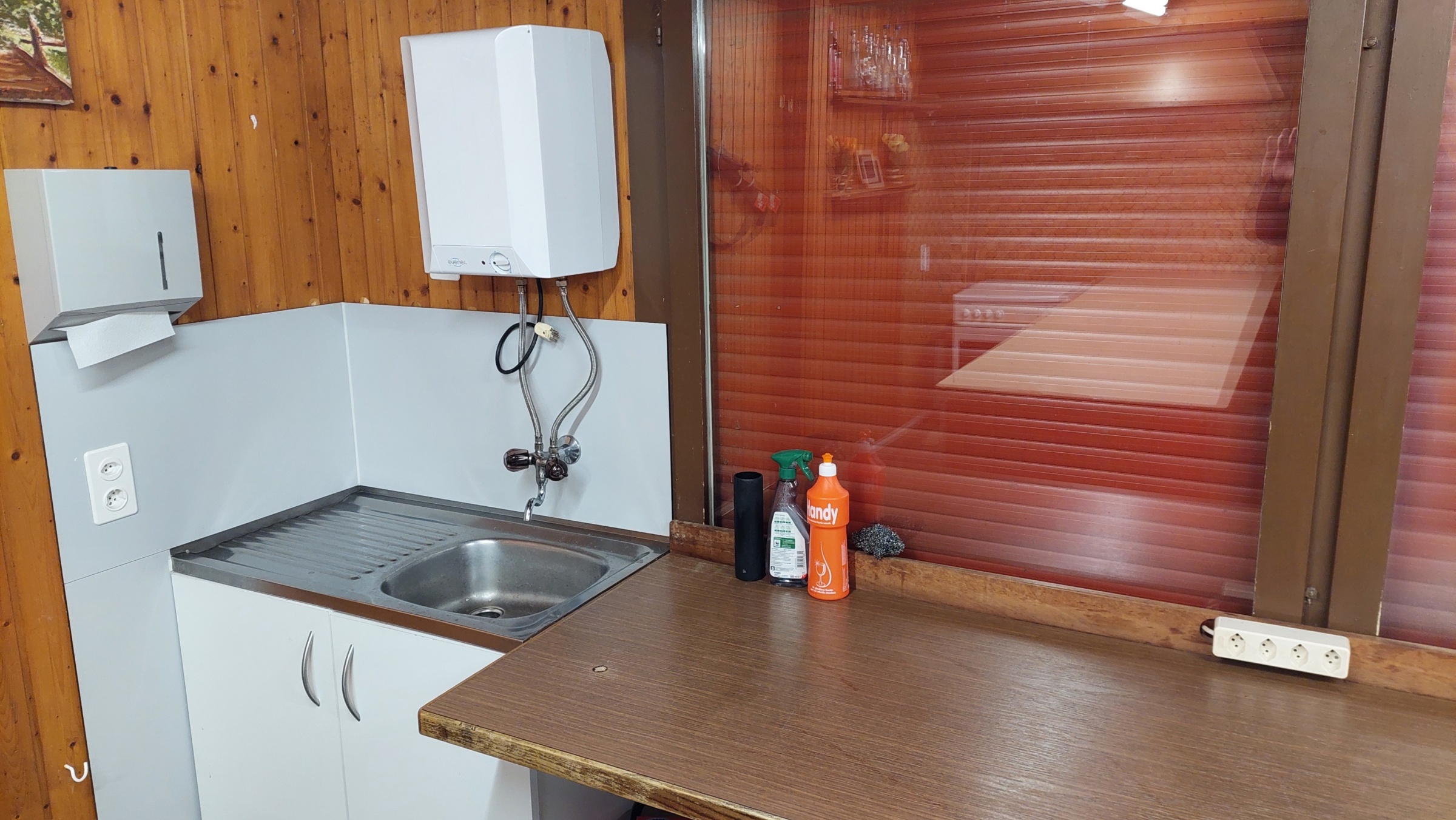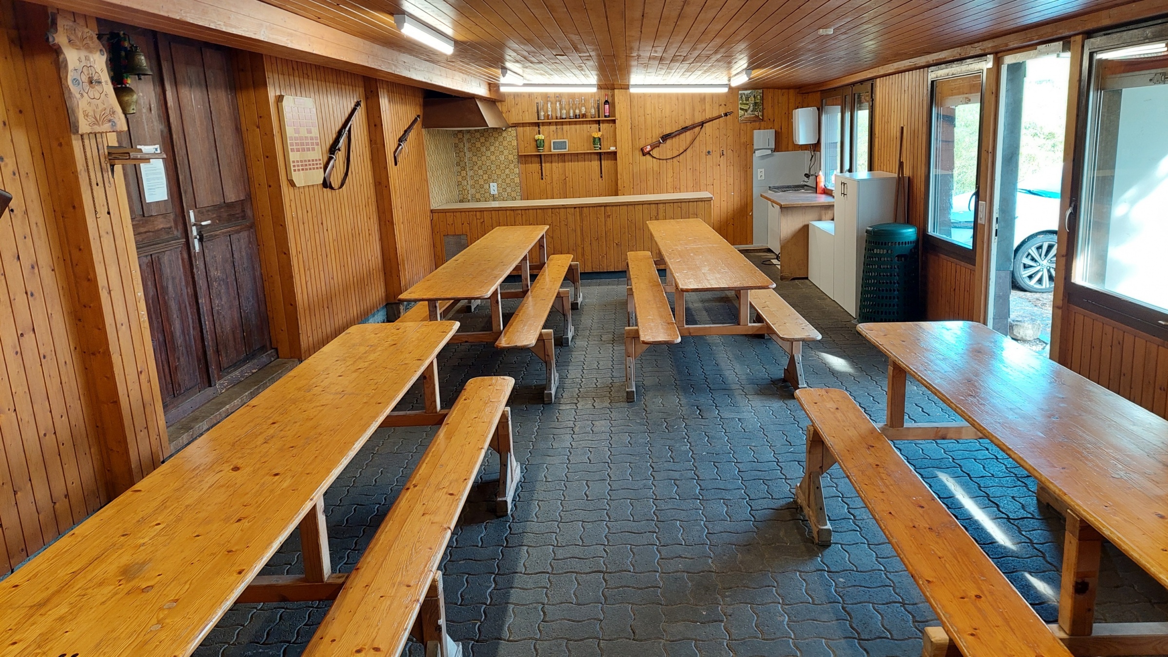 Infrastruktur: Festbänke, Heizung, Kühlschubladen, Abwaschgelegenheit, WC, Geschirr für ca. 40 Personen.